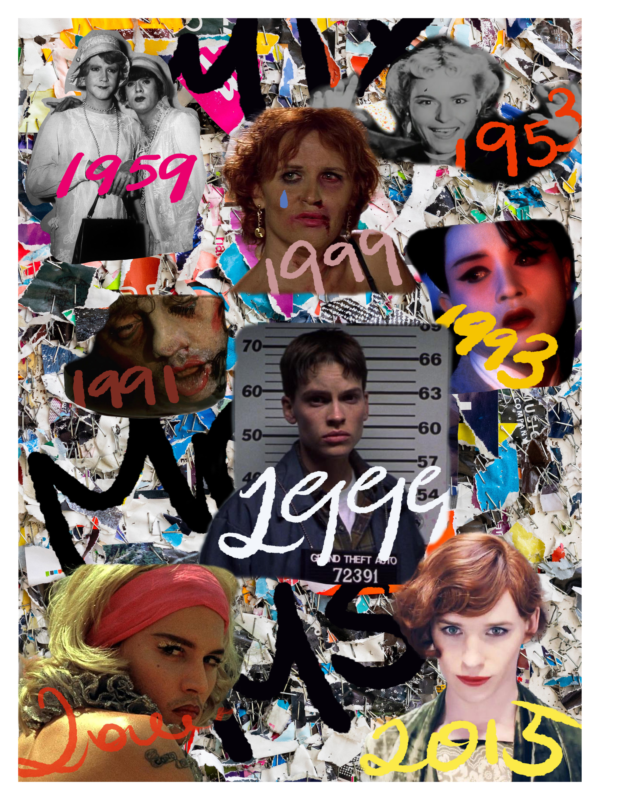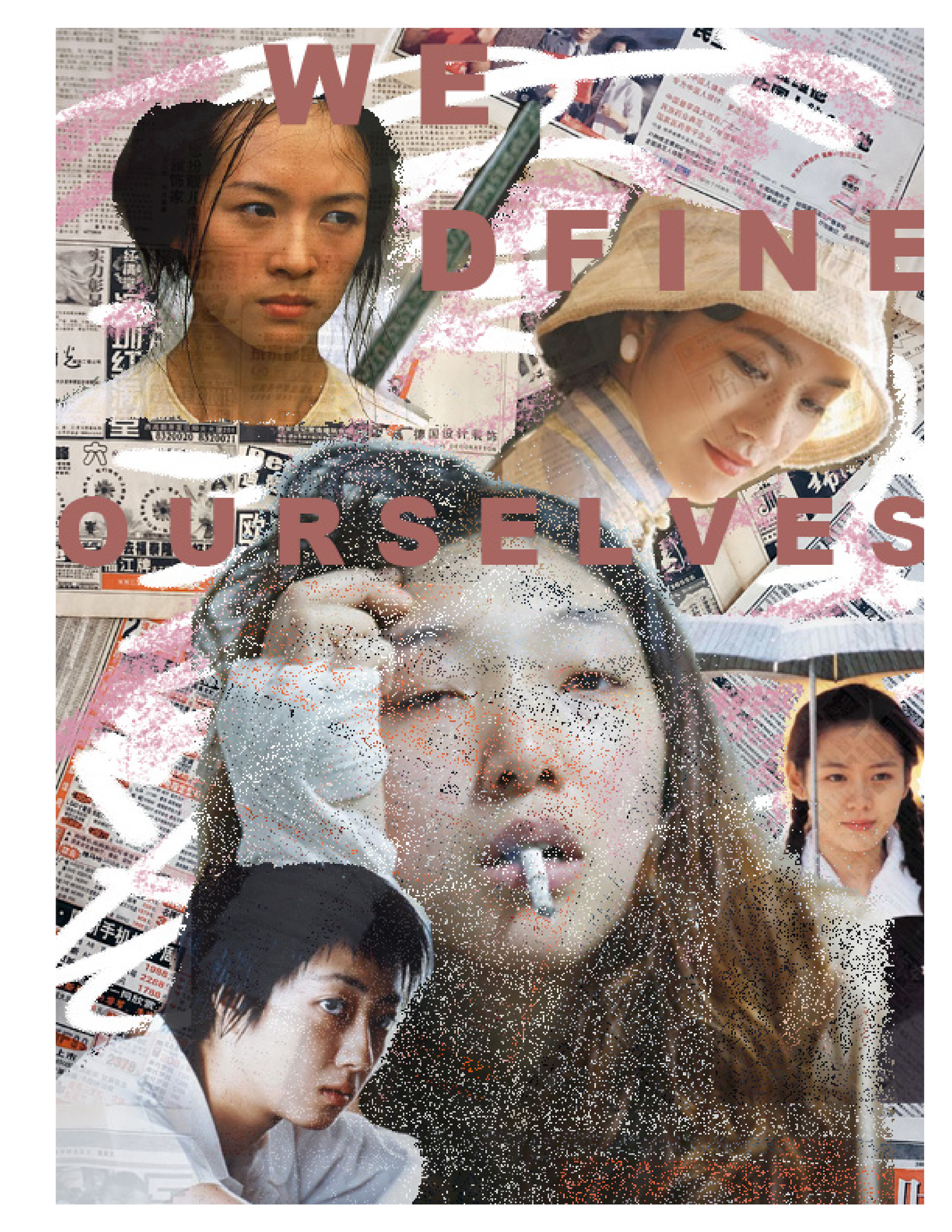 A series of graphic design works made for a Media & Culture course — each piece uses collage, typography, and appropriated imagery to examine how film and popular media construct identity. The works explore race, gender, and representation: who gets to be seen, and on whose terms.
