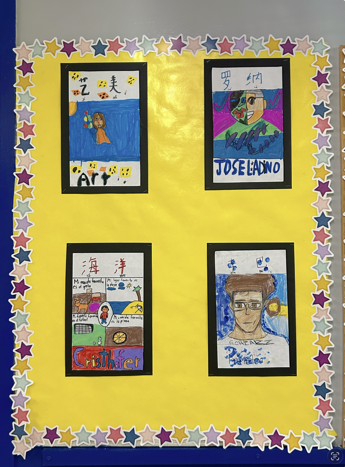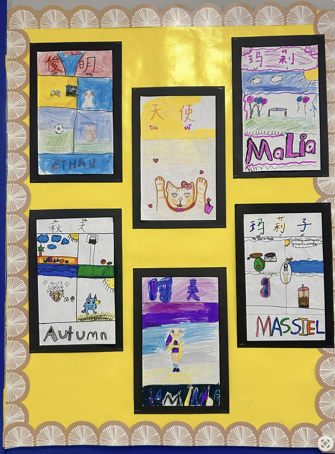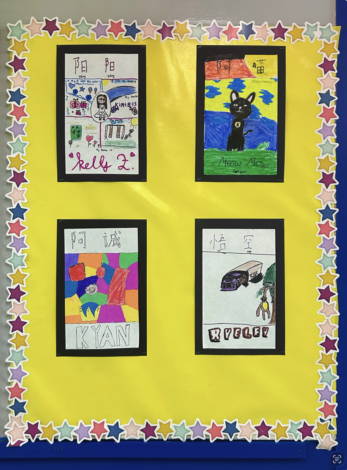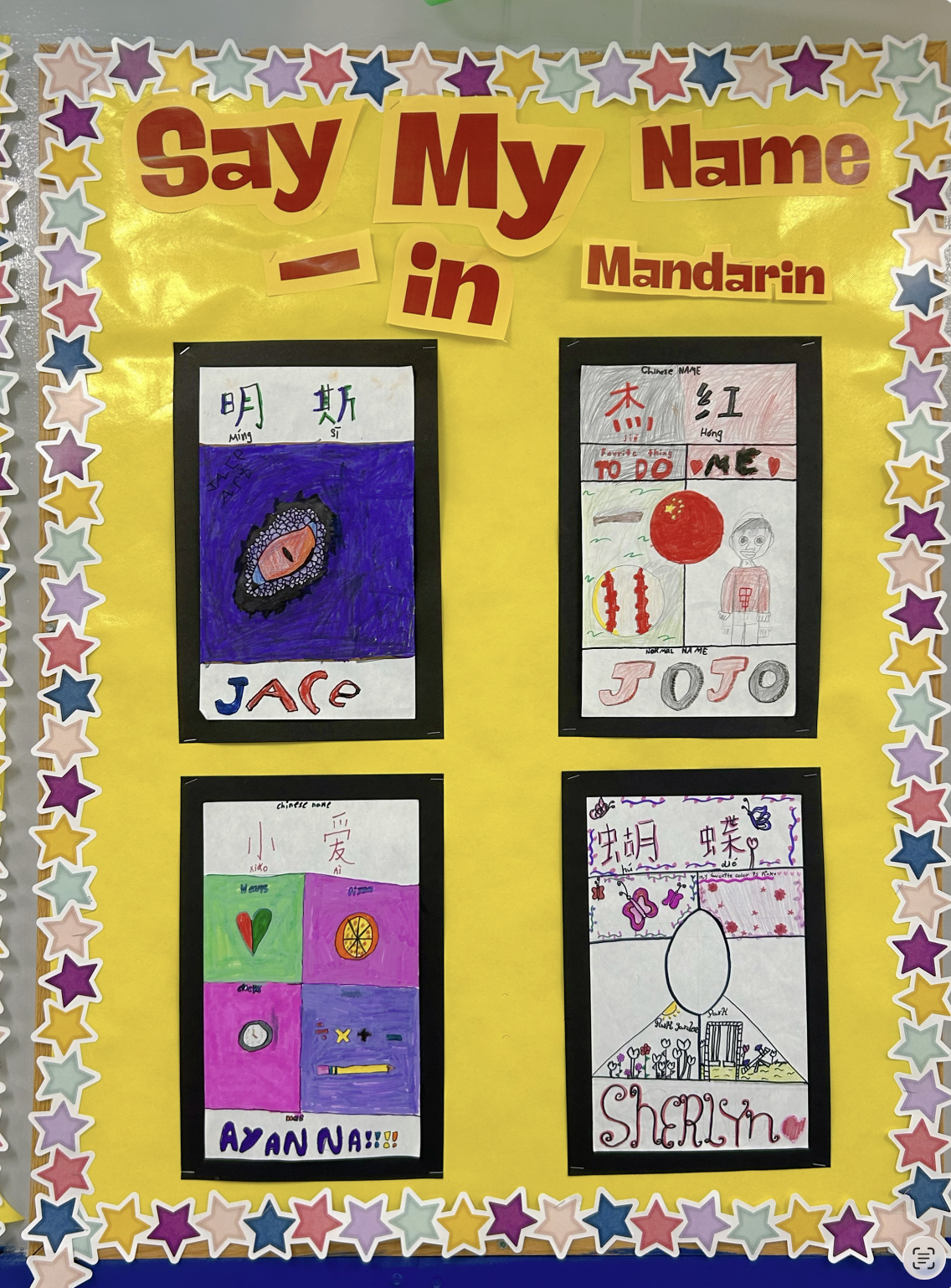 Students design their names in Mandarin while creating visual elements that represent their personal identity, connecting language, culture, and self-expression.